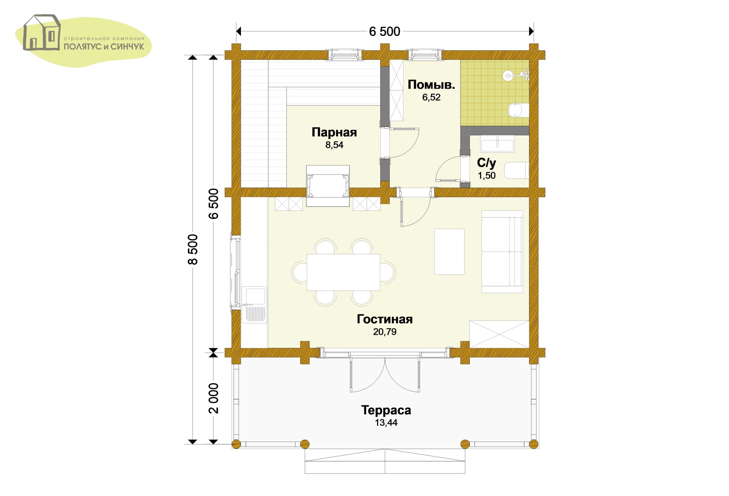 —  Четкое зонирование: гостевая/общая зона (гостиная 20,79) отделена от приватной (парная 8,54, помещение с душем 1,50)