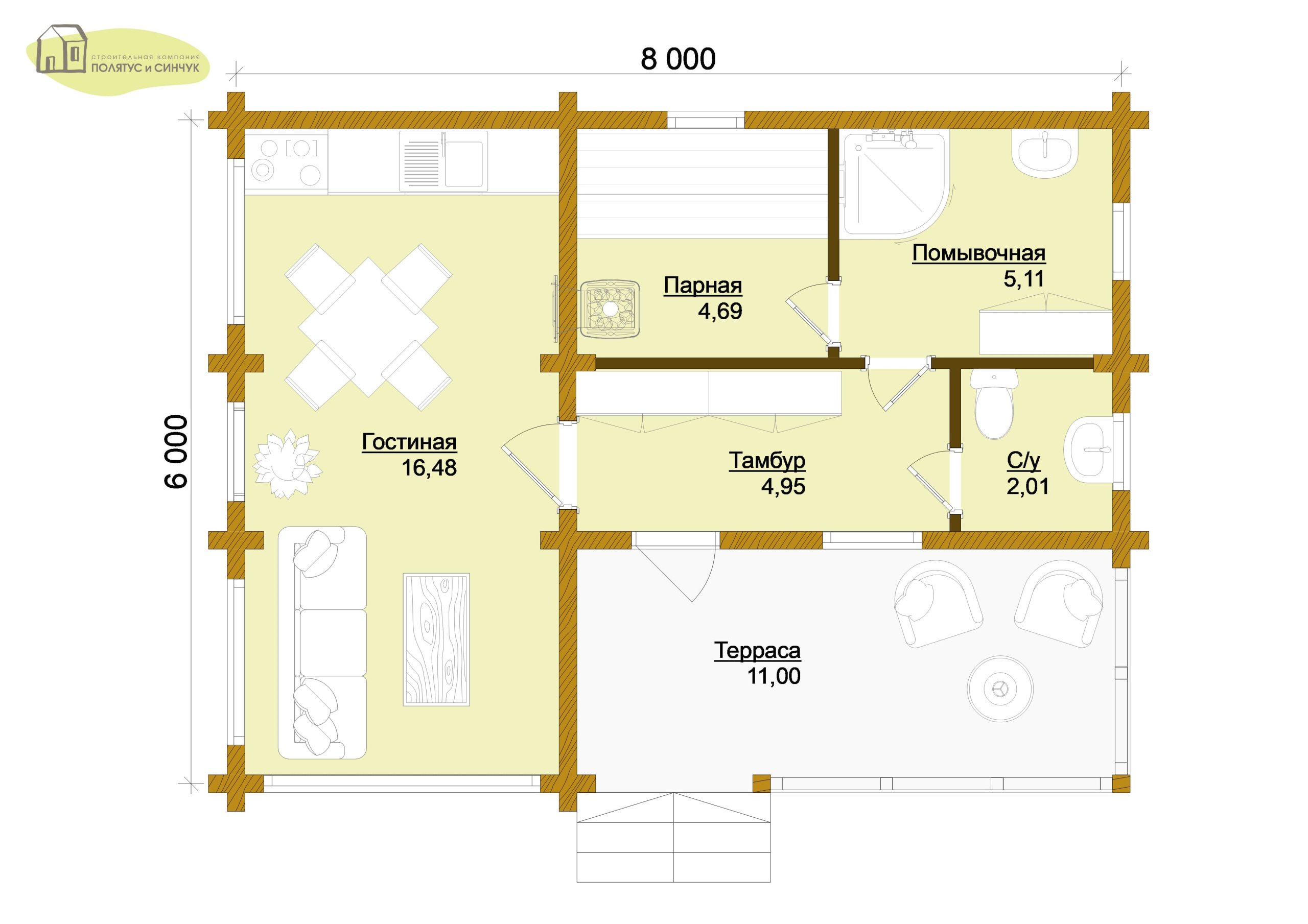 —  Чёткая планировка с логичными зонами: гостиная, парная/помывочная и отдельная тёплая зона с тамбуром