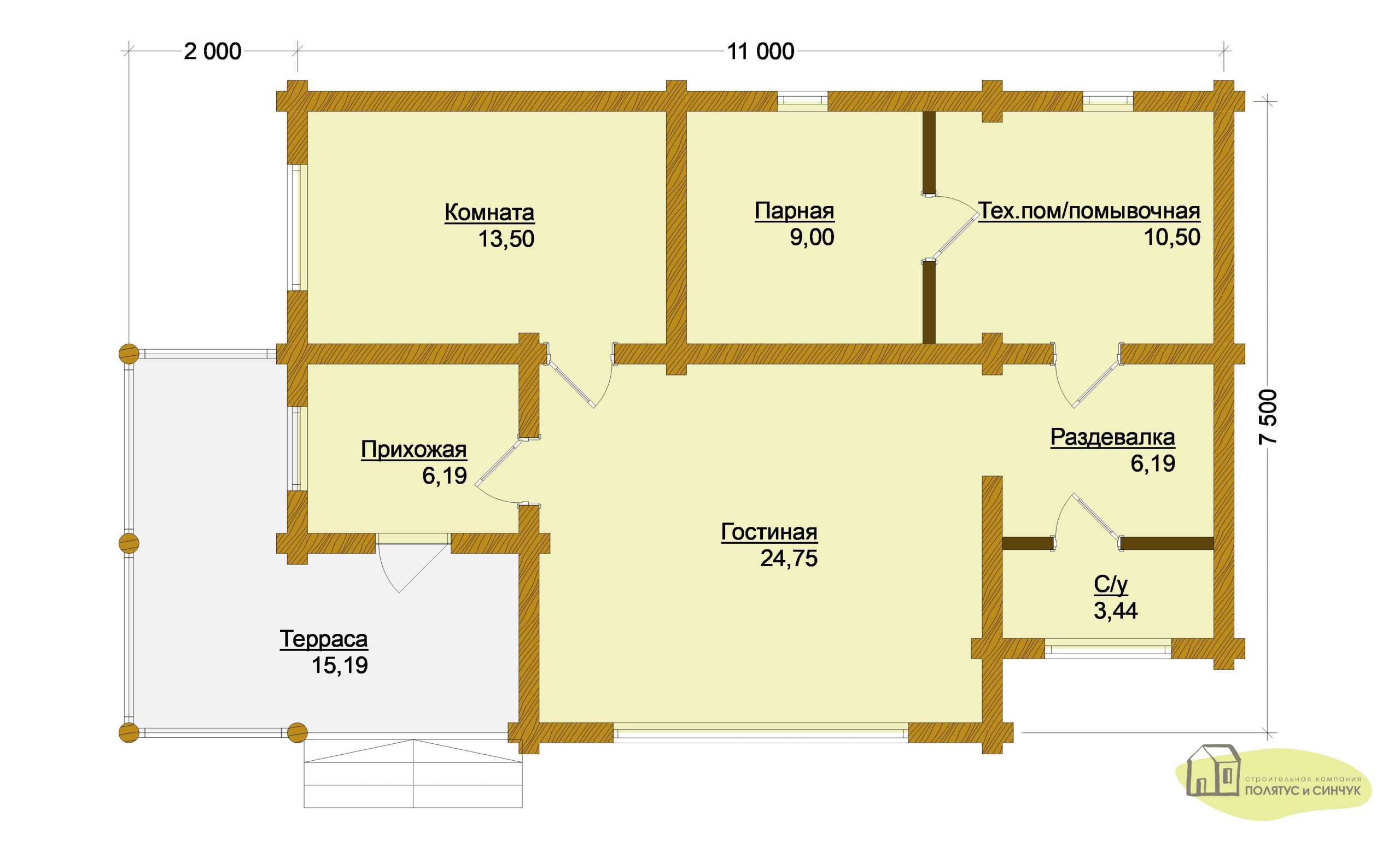 — Функциональная планировка: есть отдельные комнаты (Комната 13,50; Парная 9,00; Тех. пом/помывочная 10,50; Раздевалка 6,19; Гостиная 24,75; Прихожая 6,19; С/у 3,44)