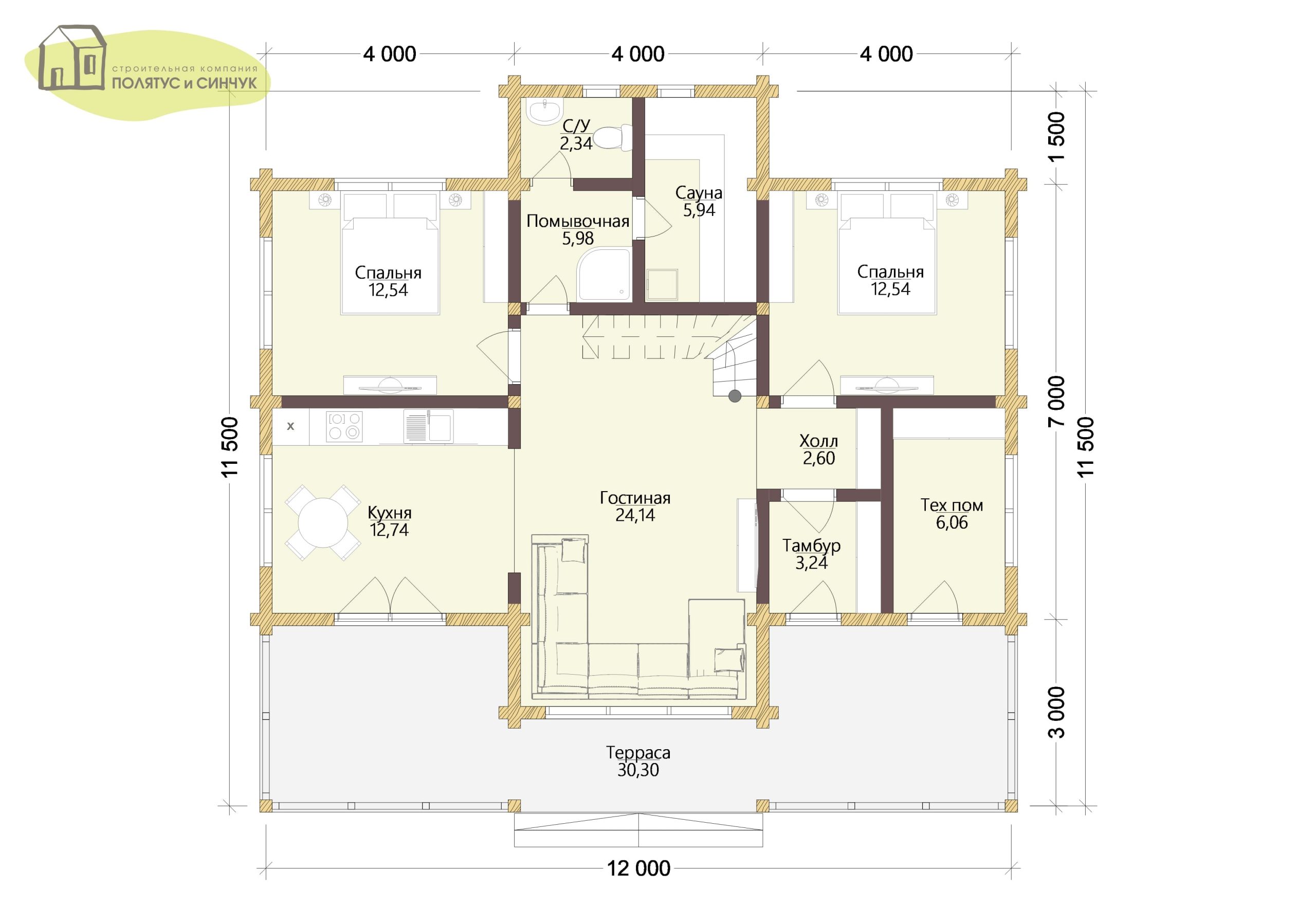 — Сервисный блок (С/У, помывочная, сауна) сгруппирован компактно, экономит инженерные коммуникации