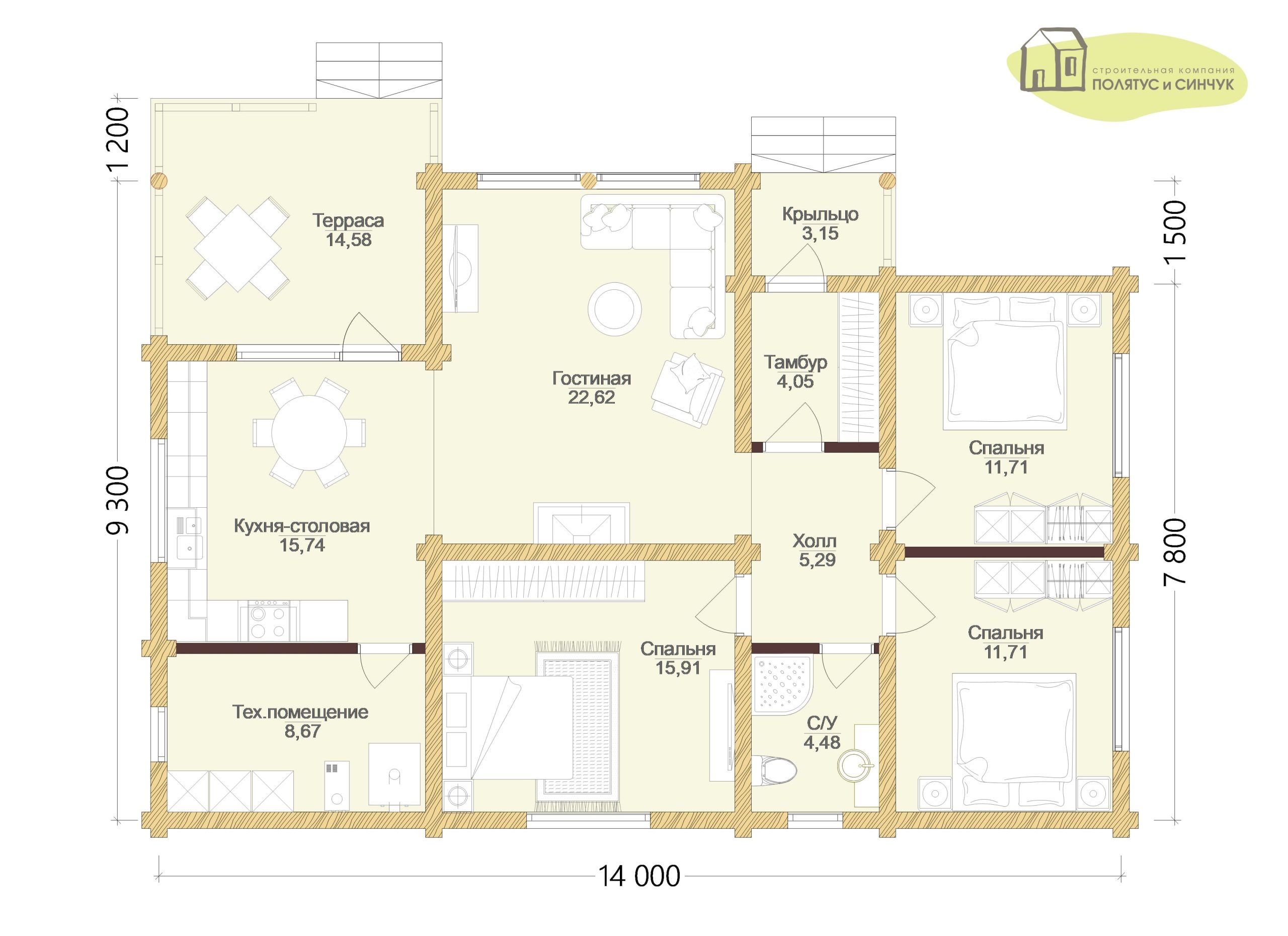 —  Чёткое зонирование на общественную (кухня-столовая, гостиная, терраса) и приватную (спальни) части