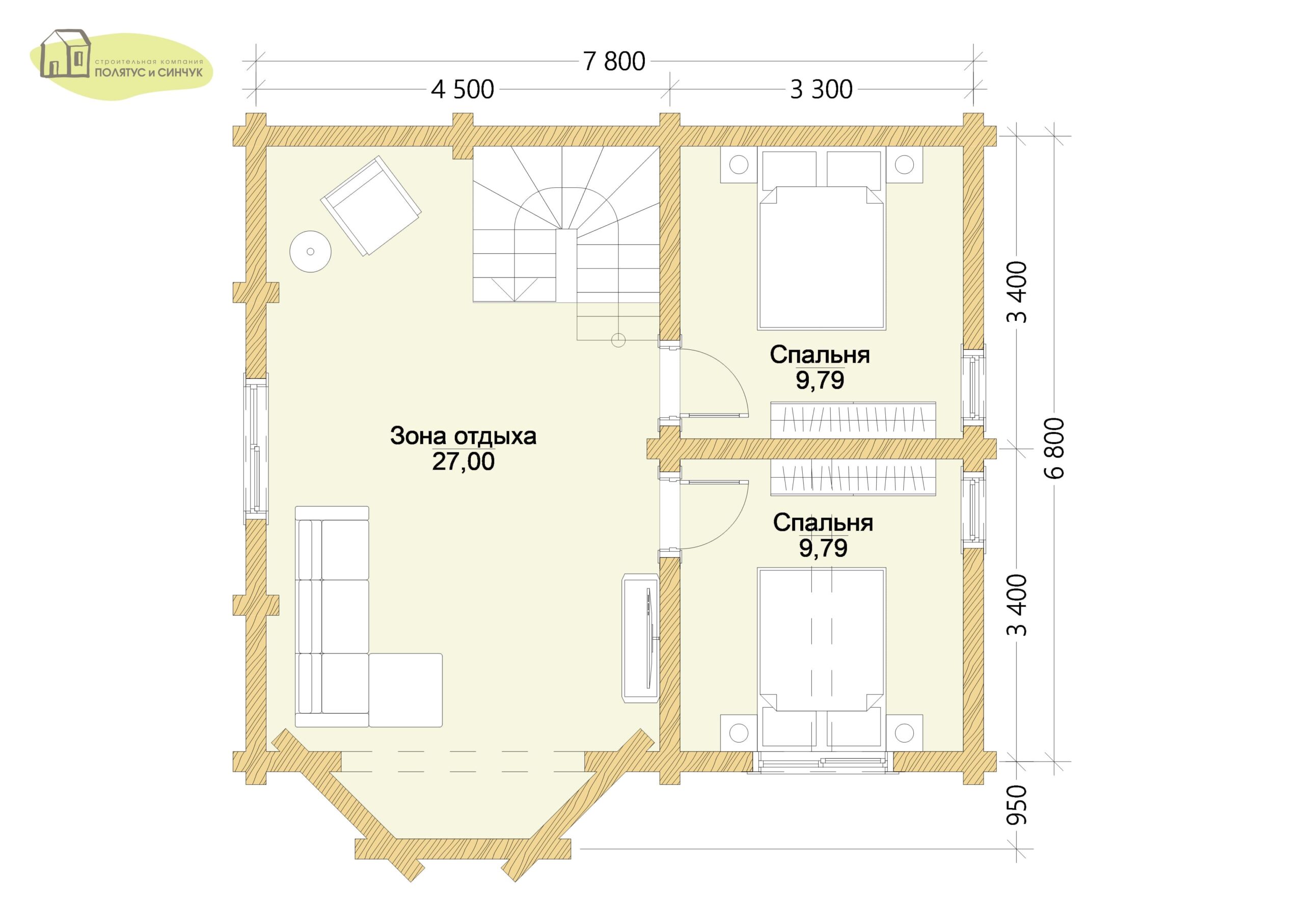 — Чёткое зонирование: большая общая зона отдыха 27,00 м² и две отдельные спальни по 9,79 м²