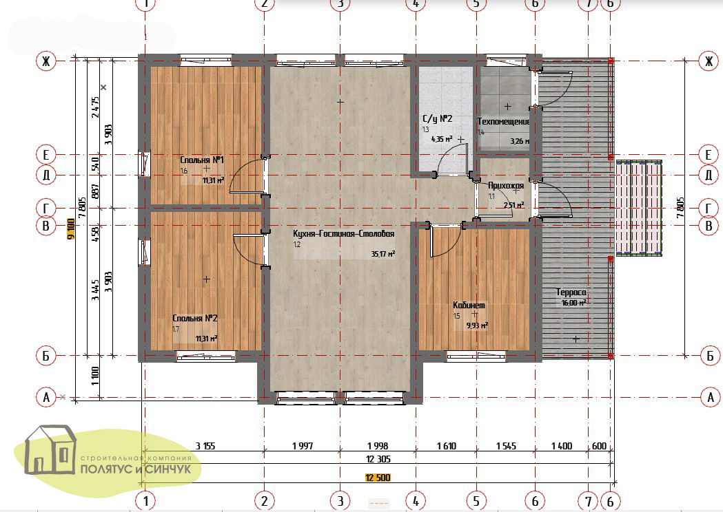 — Чёткая и читаемая планировка с нанесёнными размерами и осями