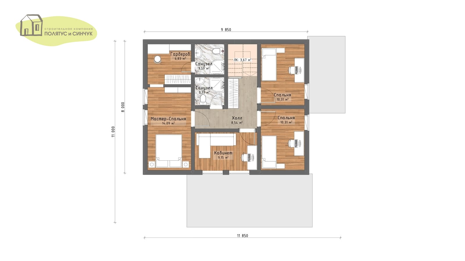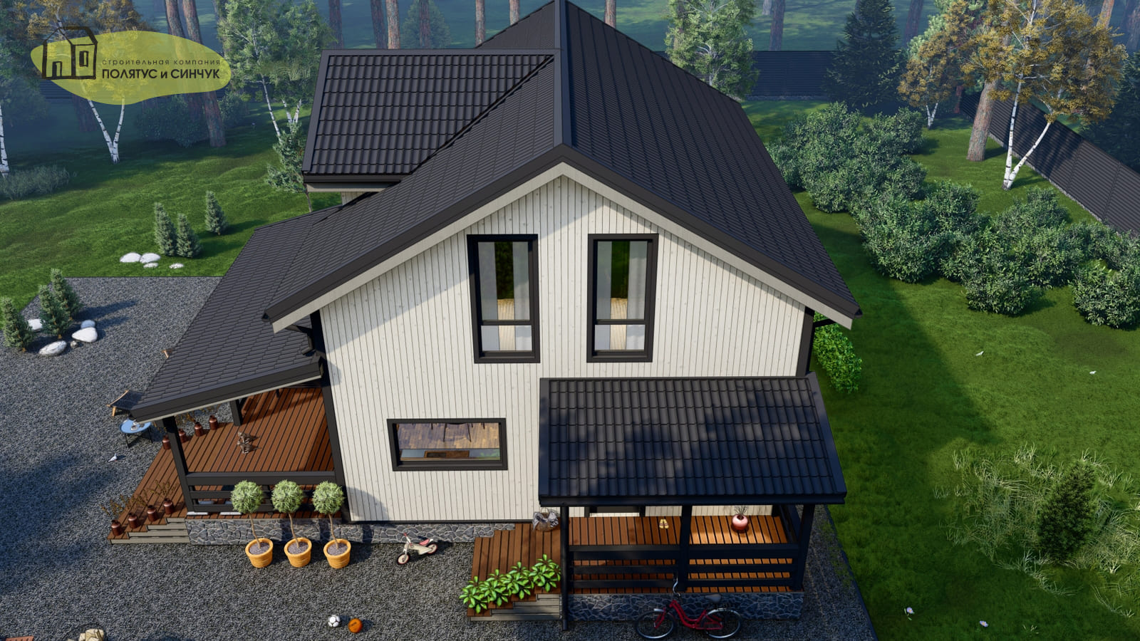 — Четкое зонирование — приватная зона (мастер-спальня) на втором этаже отделена от других спален