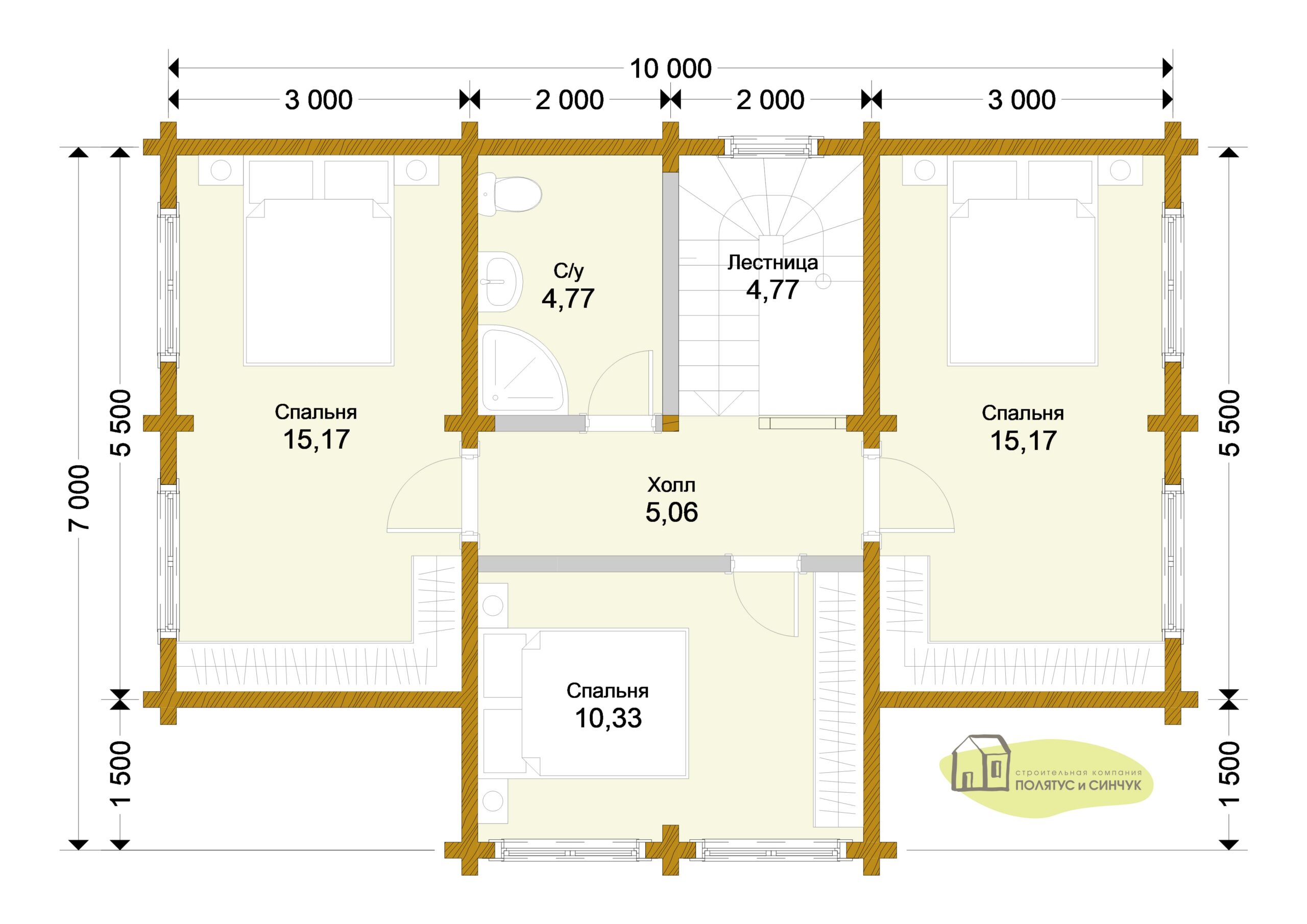 — Приемлемые площади основных помещений (две спальни по 15,17 м² и одна 10,33 м²)