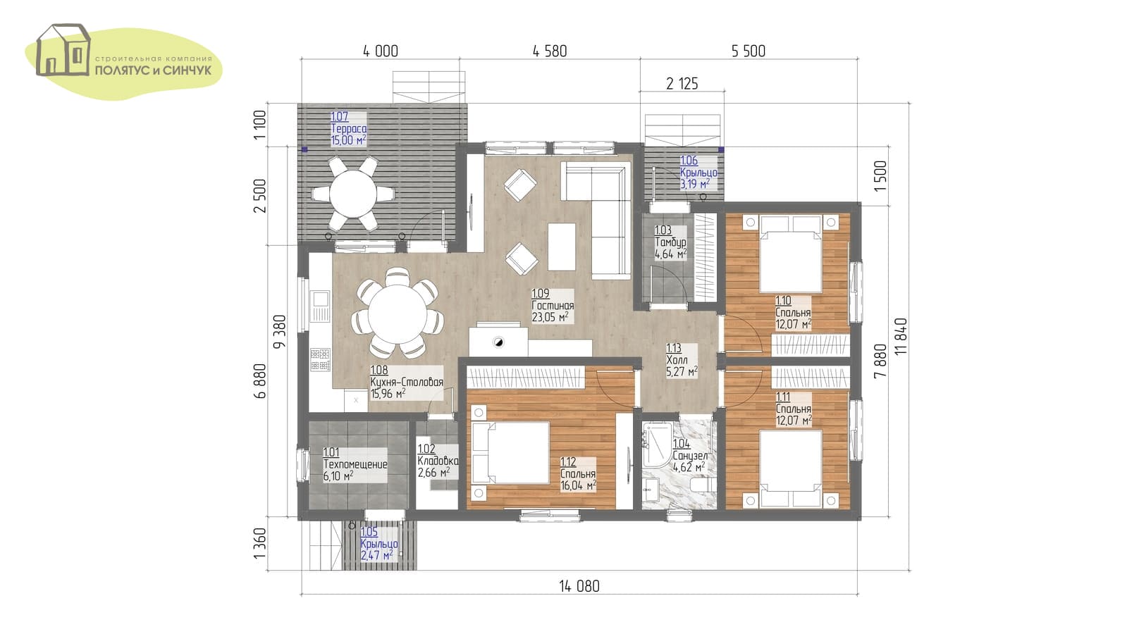 —  Чёткое зонирование: объединённая дневная зона (кухня-столовая + гостиная) отделена от спальной части