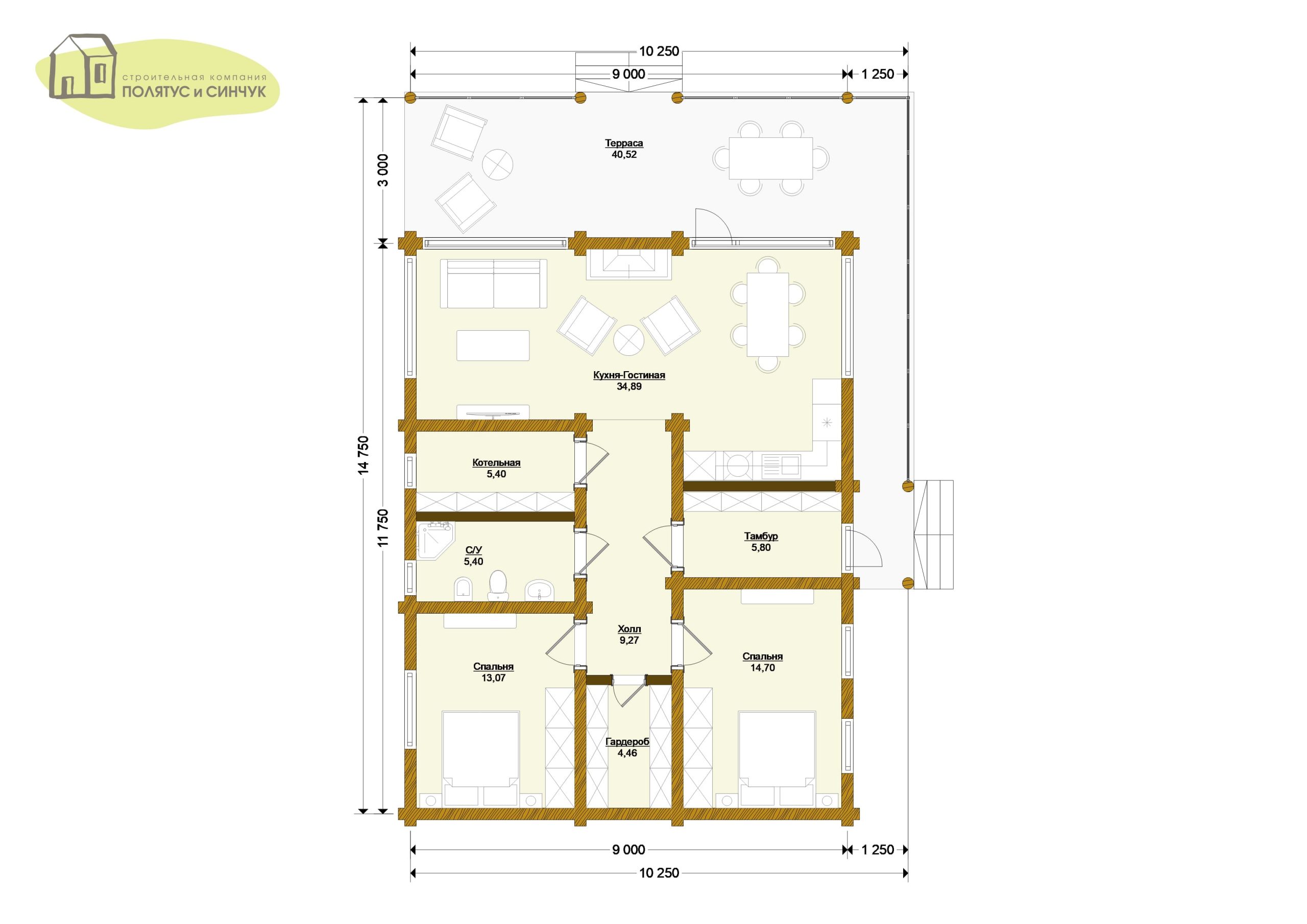 — Чёткое зонирование: общая зона (кухня‑гостиная + терраса) отделена от приватной (спальни)